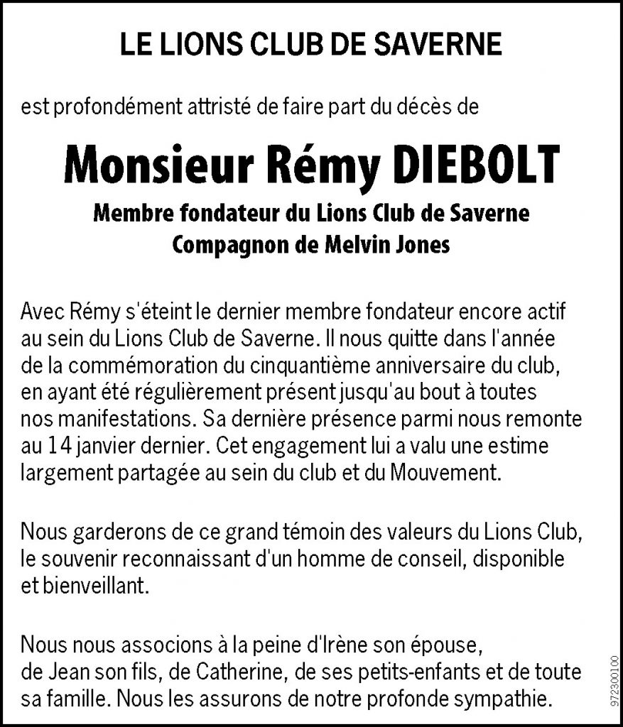 Rémy DIEBOLT, dernier membre fondateur encore en activité au sein du Lions Club de Saverne, nous a quittés le 24 janvier 2020.