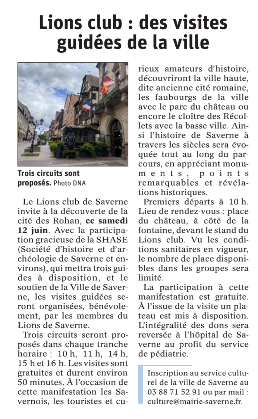 Le samedi 12 juin, la Lions Club de Saverne a proposé, en collaboration avec le SHASE (Société d’histoire et d’archéologie de Saverne et environs)  plusieurs visites guidées et commentées de la Ville. Cette action s’inscrivant dans la journée nationale des Lions a permis à de nombreuses  personnes de profiter de cette découverte. Cette opération a bénéficié du total soutien des services de la Ville de Saverne,  partenaires des deux structures, Lions Club et SHASE.